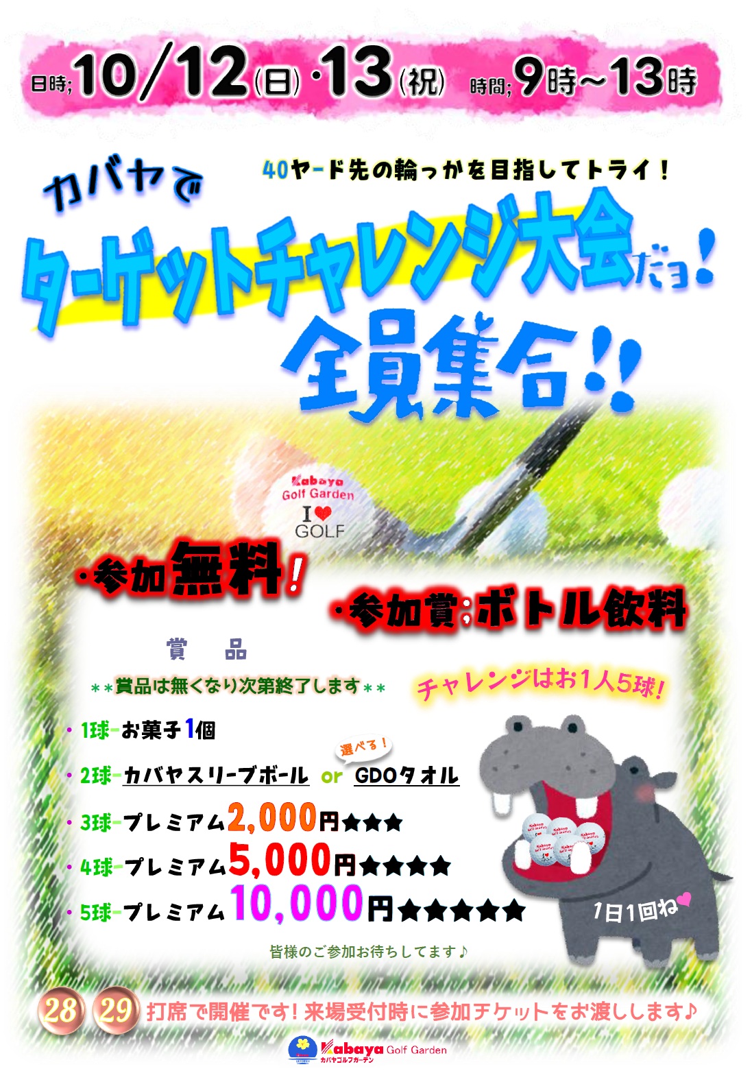NEWS お知らせ トップへ戻る 2025.10.11 10/12㈰・13㈷開催『ターゲットチャレンジ大会』のお知らせ 参加賞あり!もちろん参加費無料。打席受付した方ならどなたでも参加できます。 目指すターゲットは40ヤード先!!! チャレンジはお1人5球。成功しても?失敗しても?どちらでもいーーーーーんです! KGGで楽しいひと時をお過ごしください♪ 皆様のご参加をお待ちしています٩( ''ω'' )و トップへ戻る